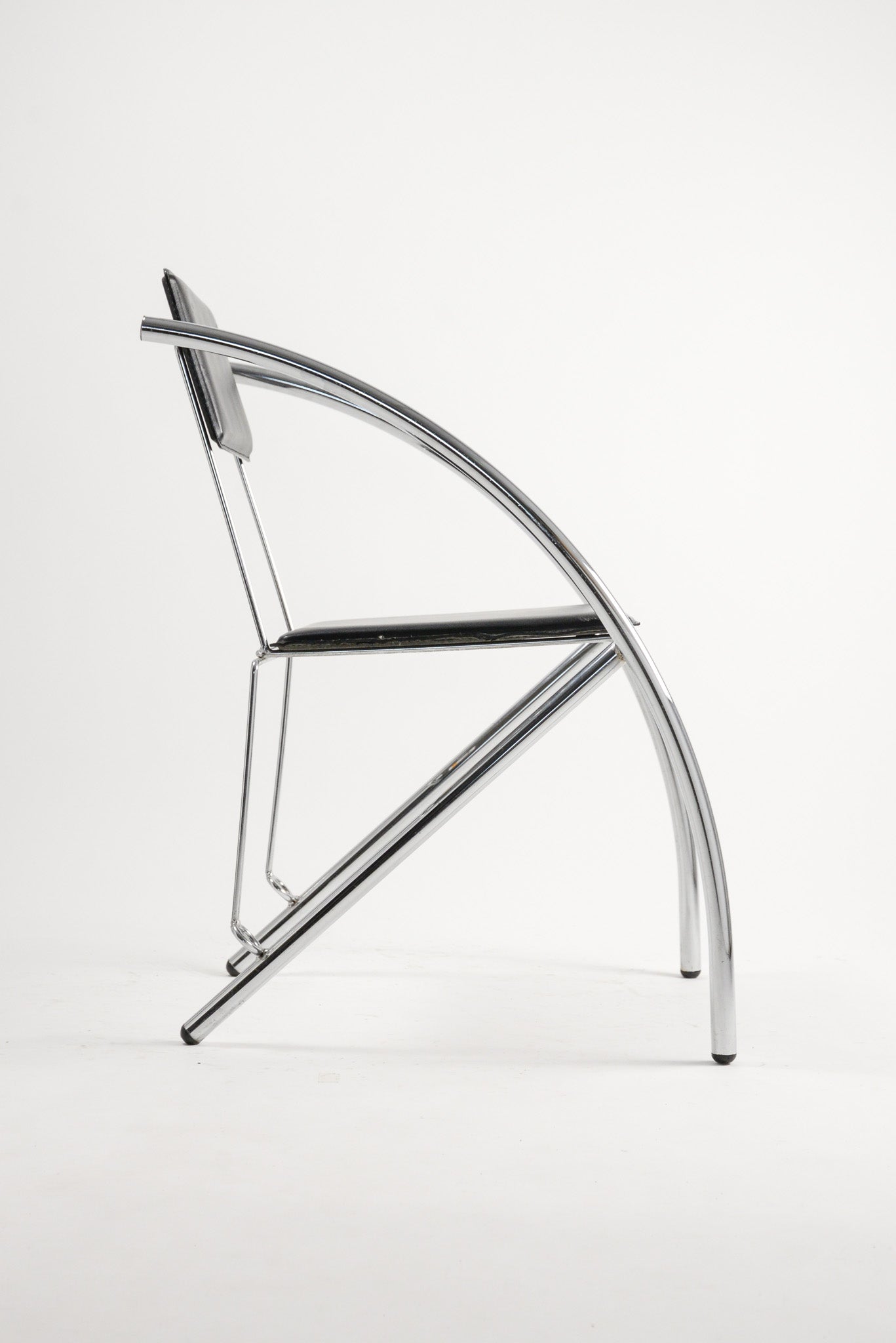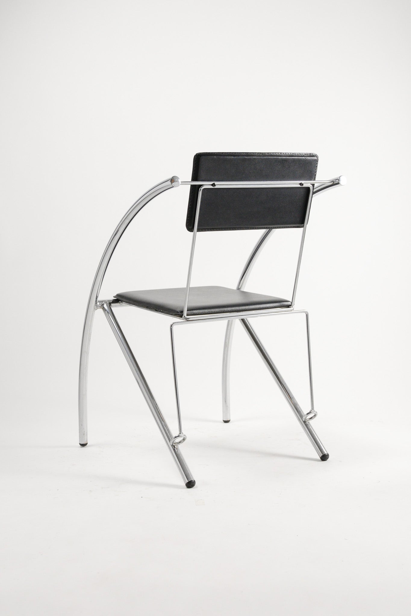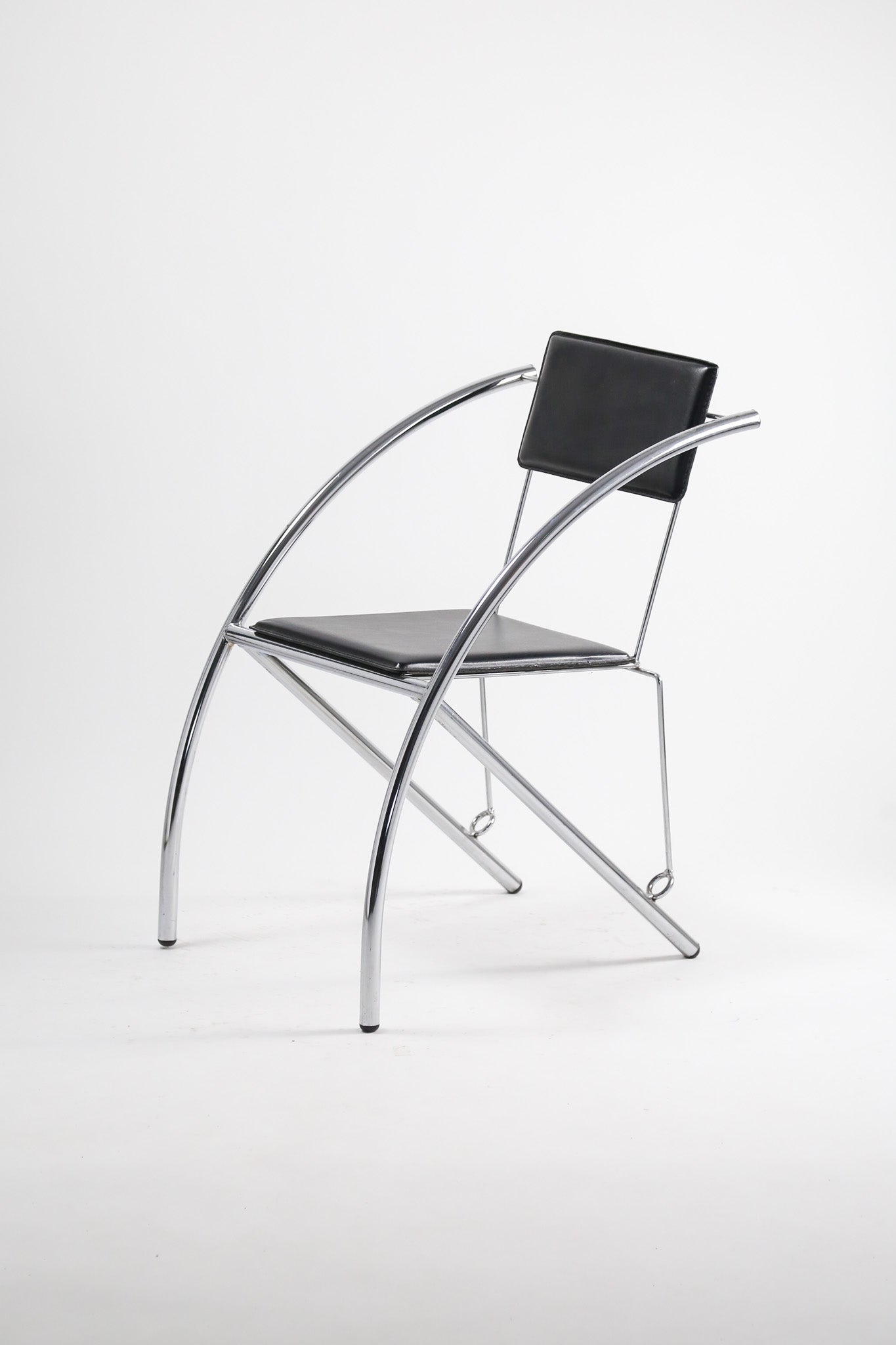 最大の特徴は、背もたれから脚部にかけてダイナミックに弧(アーク)を描くクロームメッキのフレーム。この流麗なラインは、視覚的な軽やかさと都会的なモダンさを両立させています。
