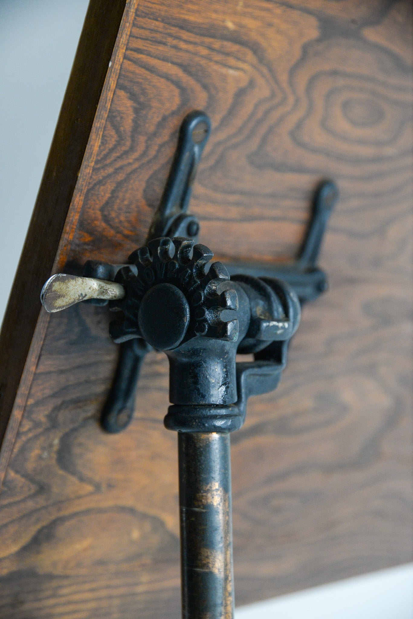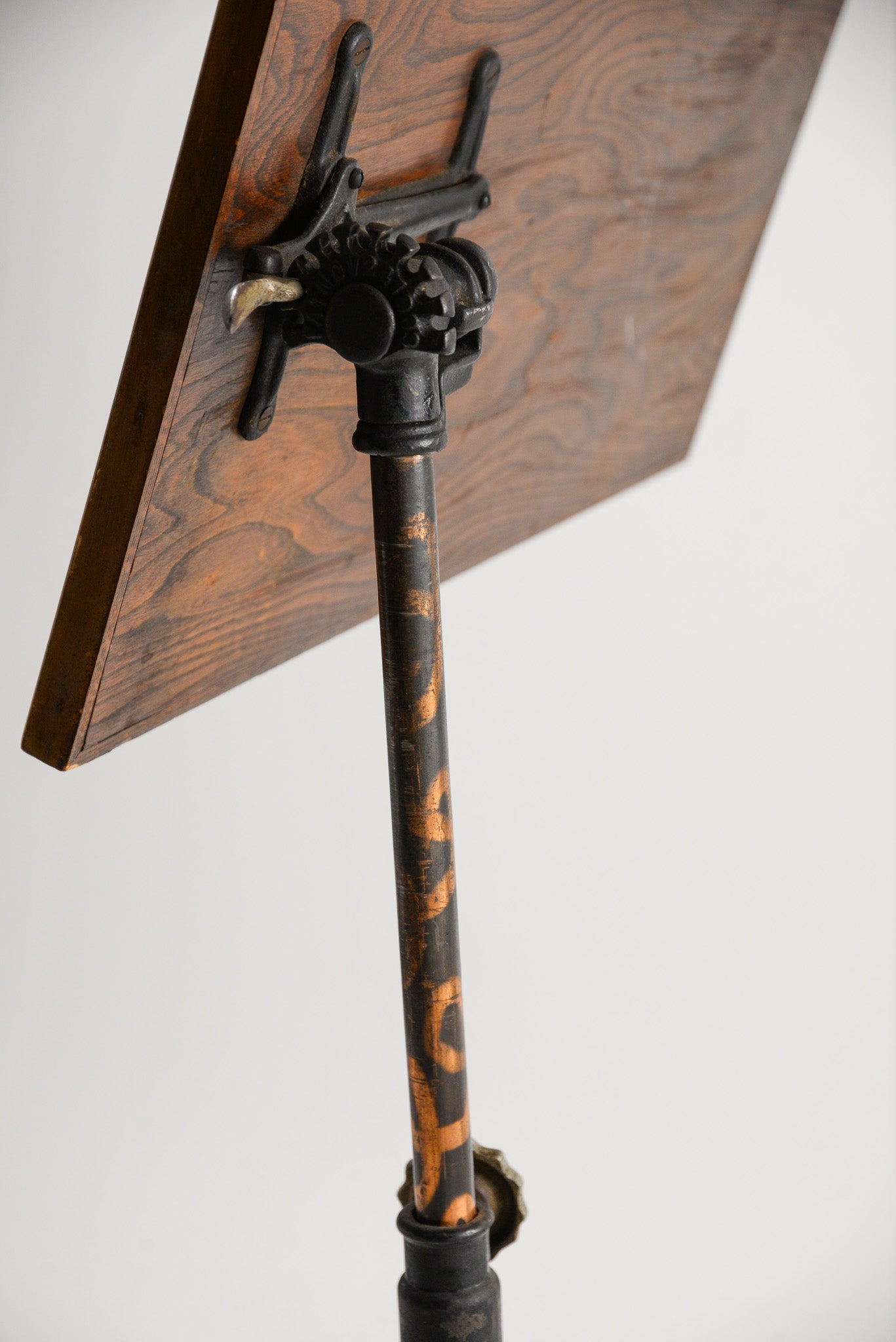 支柱のツマミで高さが調整できるほか、天板下の重厚なギアを操作することで、天板の角度を水平から垂直近くまで自在に変えることができます。