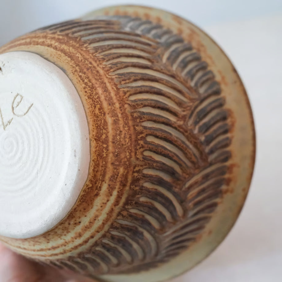 規則的に刻まれた模様は日本の飛び鉋の技法のようにも見えます。